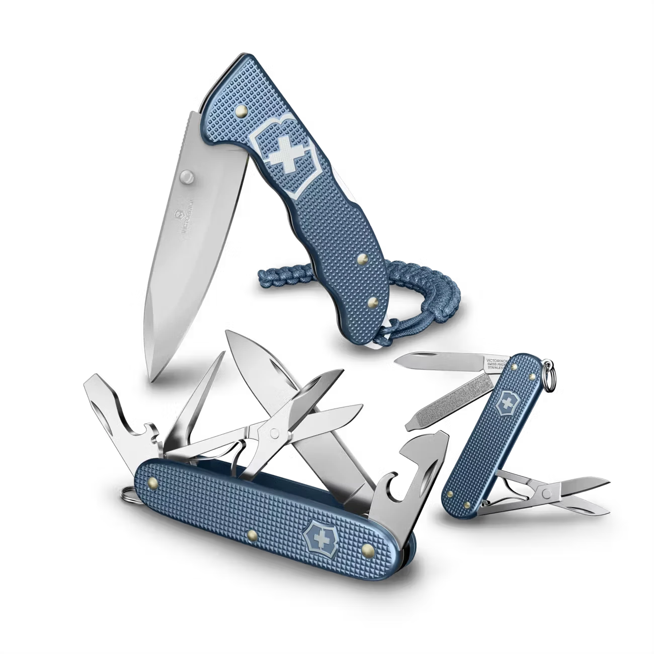 Includes all 3 models of the 2026 Glacial Blue Alox collection Swiss made pocket knife featuring embossed and anodized aluminum scales